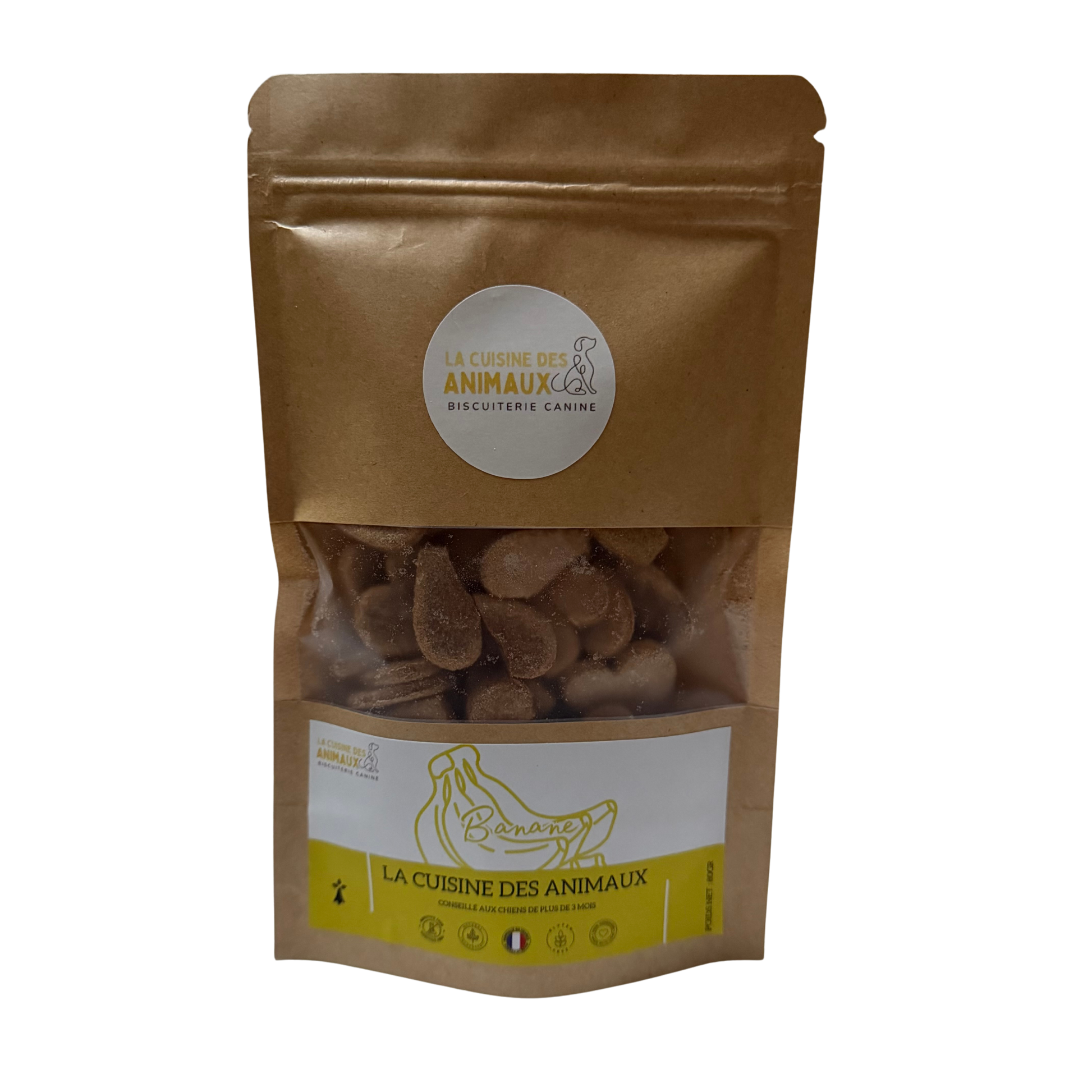 Nos biscuits à la banane sont fabriqués artisanalement avec des ingrédients simples et soigneusement sélectionnés, pour offrir à votre chien une friandise à la fois savoureuse, naturelle et facile à digérer. La banane apporte une touche naturellement sucrée très appréciée des chiens, tout en contribuant à leur bien-être digestif. Leur texture croquante en fait une récompense idéale au quotidien ou lors des séances d'éducation.🍌